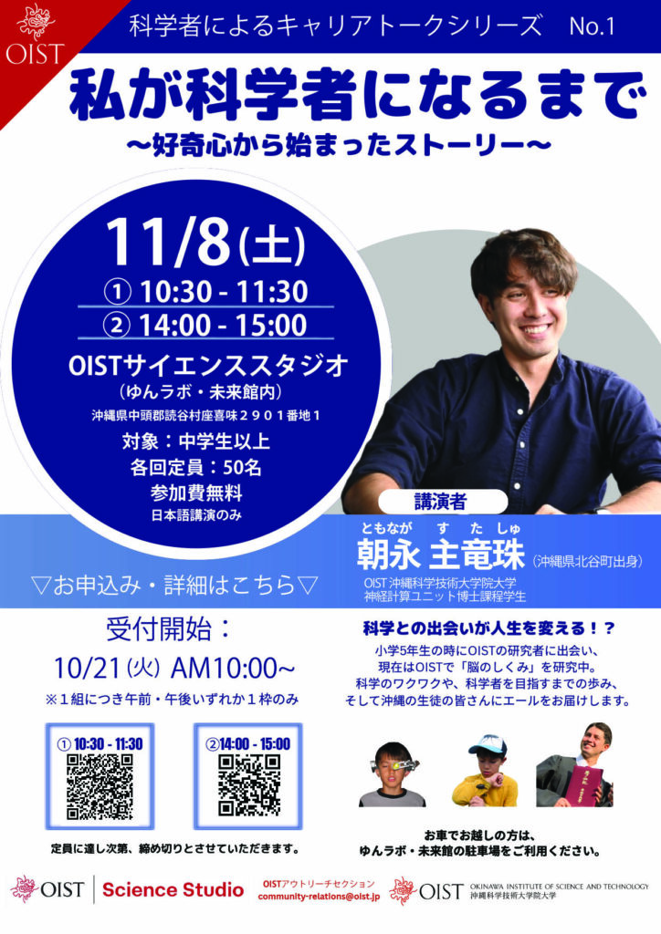 - [イベント 11/8] OIST | Science Studio【申込サイト】https://groups.oist.jp/node/43880【日程】11月8日(土)午前の部:10時30分~11時30分午後の部:14時00分~15時00分 ※定員各回50名【イベント名】科学者による […]